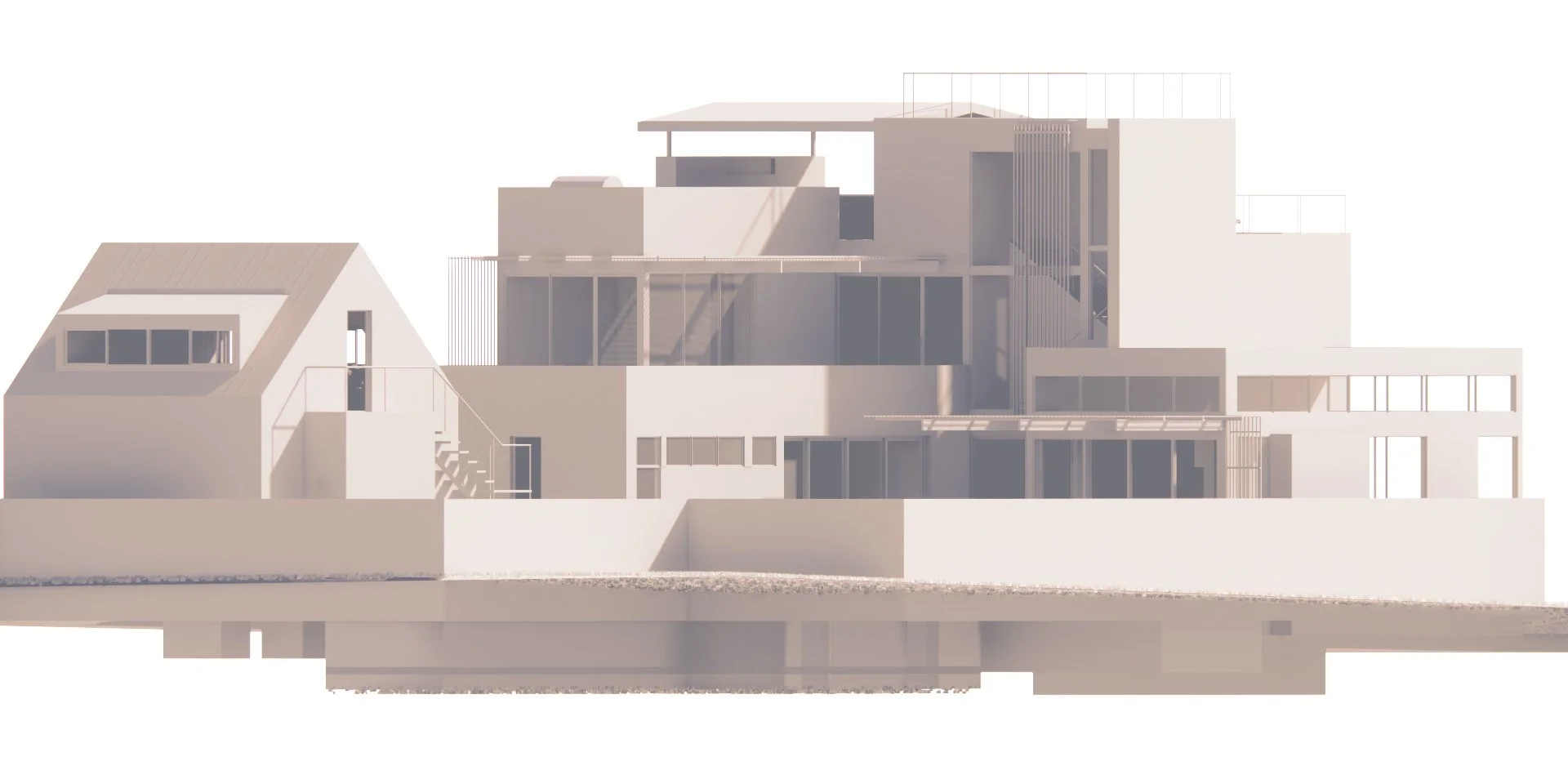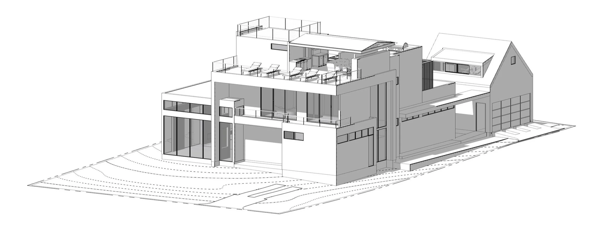 A bespoke residence featuring a viewing platform is positioned on the city side of Travis Heights. This design underwent multiple iterations before being realized as three interconnected cubes. Similar to the tale of Goldilocks and the three bears, these cubes gradually ascend the exterior, culminating in a viewing terrace offering breathtaking vistas of downtown Austin. The rear courtyard boasts a lap pool and south-facing terraces adorned with steel pergolas.