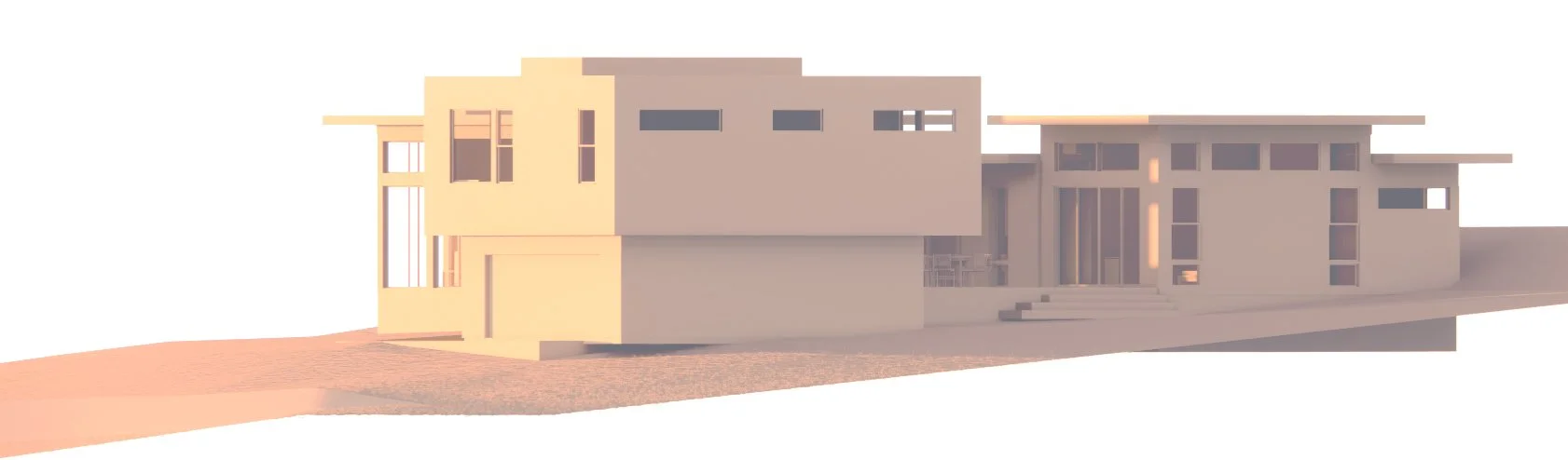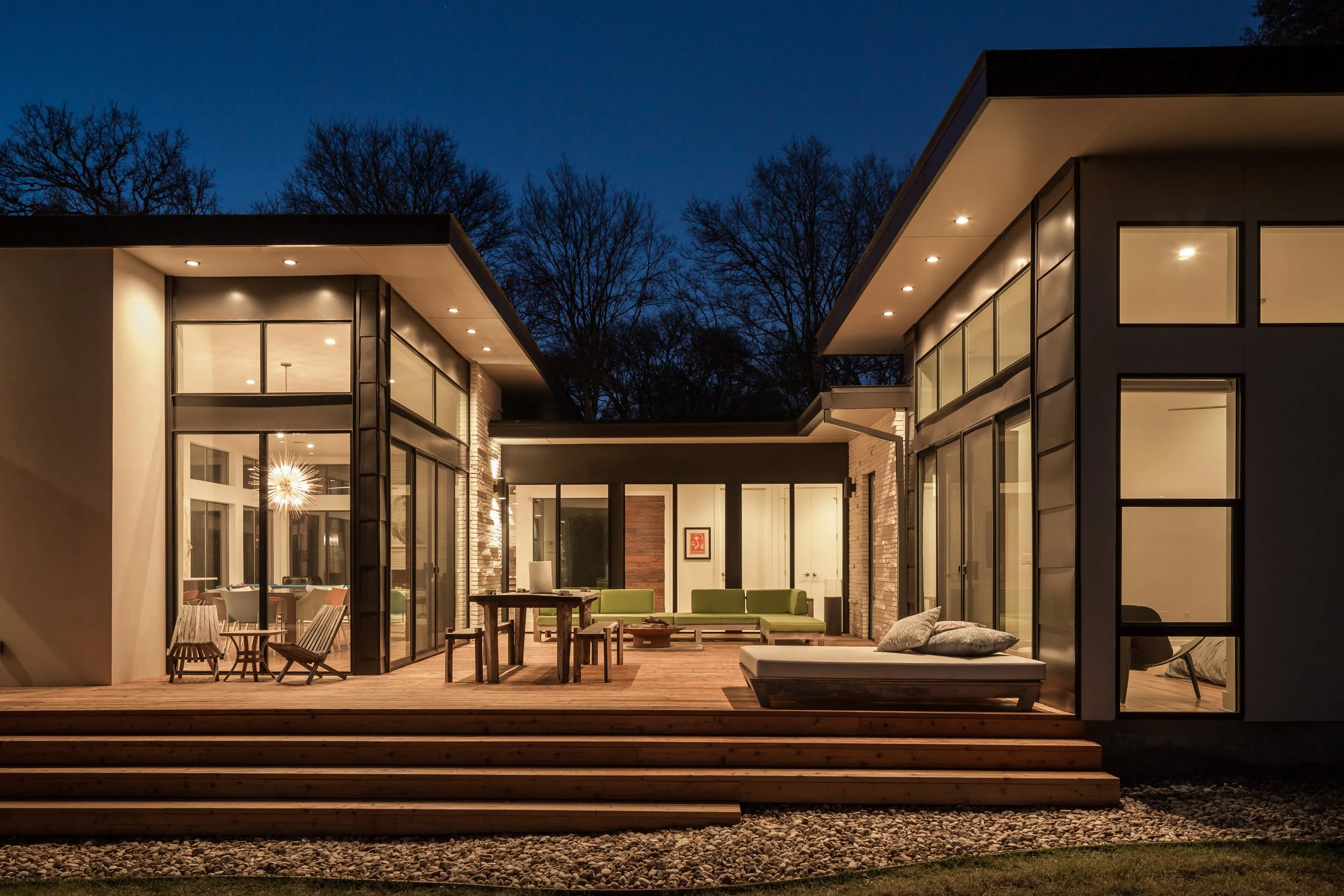 The Rockingham house occupies a corner lot, a setting we cherish for its ability to showcase the home as a sculptural masterpiece rather than merely a front-facing infill. Inspired by this corner exposure, our design centered around a living-dining kitchen area that seamlessly connects a master wing with an office and a children's wing positioned above a garage. The strategic placement of the stairs elegantly resolves the architectural forms as they turn the corner. At the entry, a solid form contrasts with a small courtyard cutout, channeling natural light into the interior spaces. This distinctive home was highlighted in the Austin Modern Homes Tour.